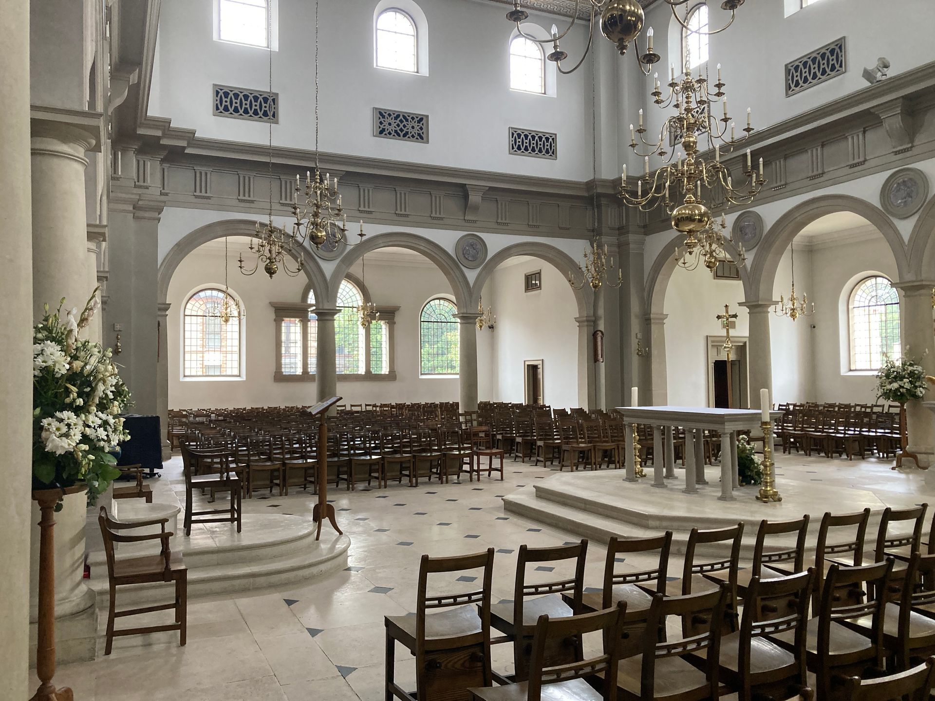 The Cathedral is the first Classical cathedral to be built in England since Wren’s St Paul’s. It was originally a neo-Gothic mission church built in the 1860s and raised to cathedral status in 1917. It was considerably enlarged in the 1970s, but this addition was replaced in 1989-91 with a neo-Classical extension designed by Quinlan Terry, inspired by the early Italian Renaissance fused with the English Baroque of Sir Christopher Wren. Clear windows on all 4 sides mean that the cathedral is flooded with light at any time of the day giving an uplifting effect. There is a central altar designed for maximum congregational participation, in keeping with the liturgical reforms of Vatican II. The rebuilt Cathedral was opened in May 1991 and in 2022 was listed as a Grade II giving it the national status of a ‘particularly important building of more than special interest’. The surrounding complex includes the original church and house of the 1830s and a former convent building of the 1870s, also remodelled by Terry and landscaped to contribute to the Brentwood town centre conservation area.