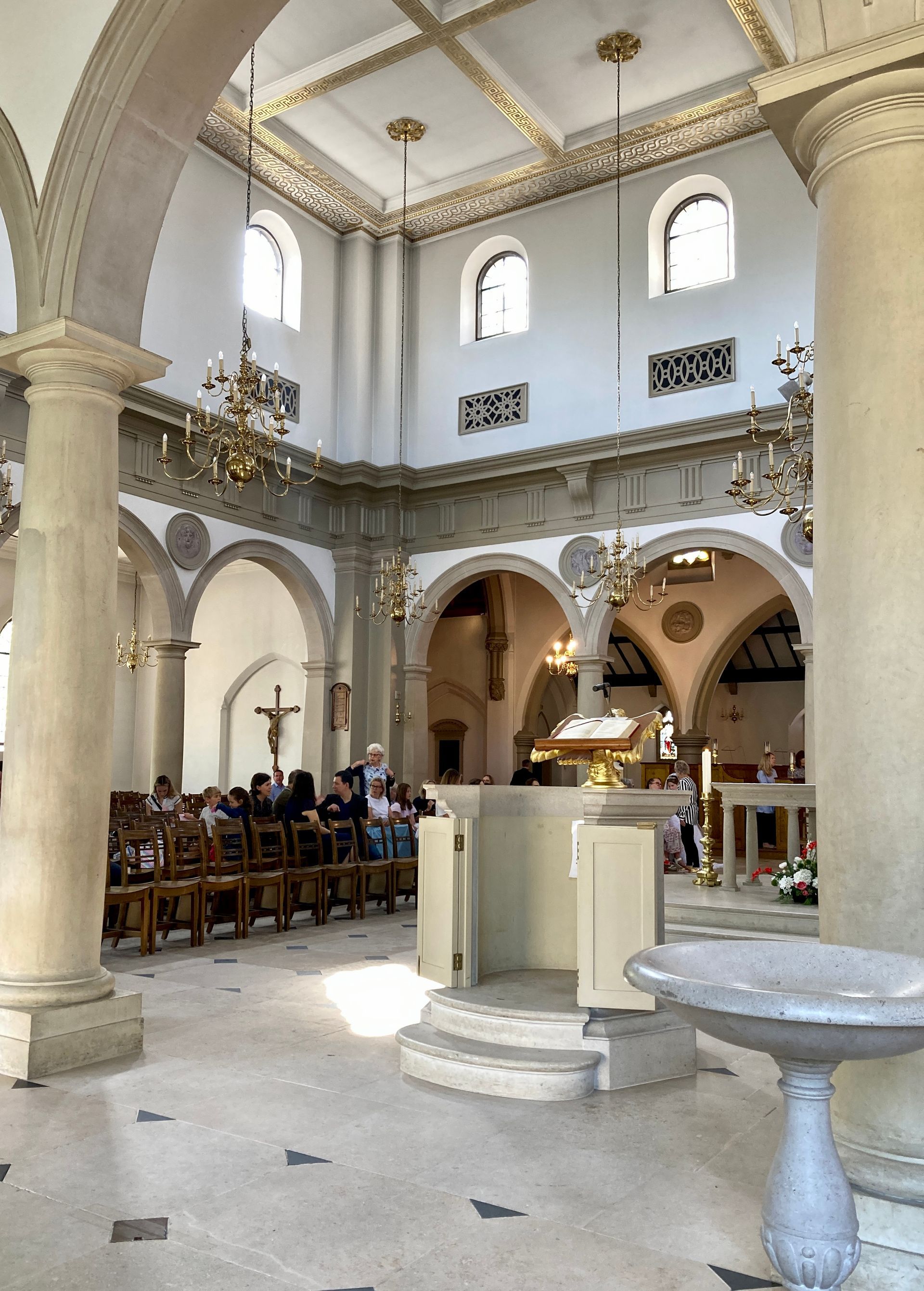 It was considerably enlarged in the 1970s, but this addition was replaced in 1989-91 with a neo-Classical extension designed by Quinlan Terry, inspired by the early Italian Renaissance fused with the English Baroque of Sir Christopher Wren. Clear windows on all 4 sides mean that the cathedral is flooded with light at any time of the day giving an uplifting effect. There is a central altar designed for maximum congregational participation, in keeping with the liturgical reforms of Vatican II.