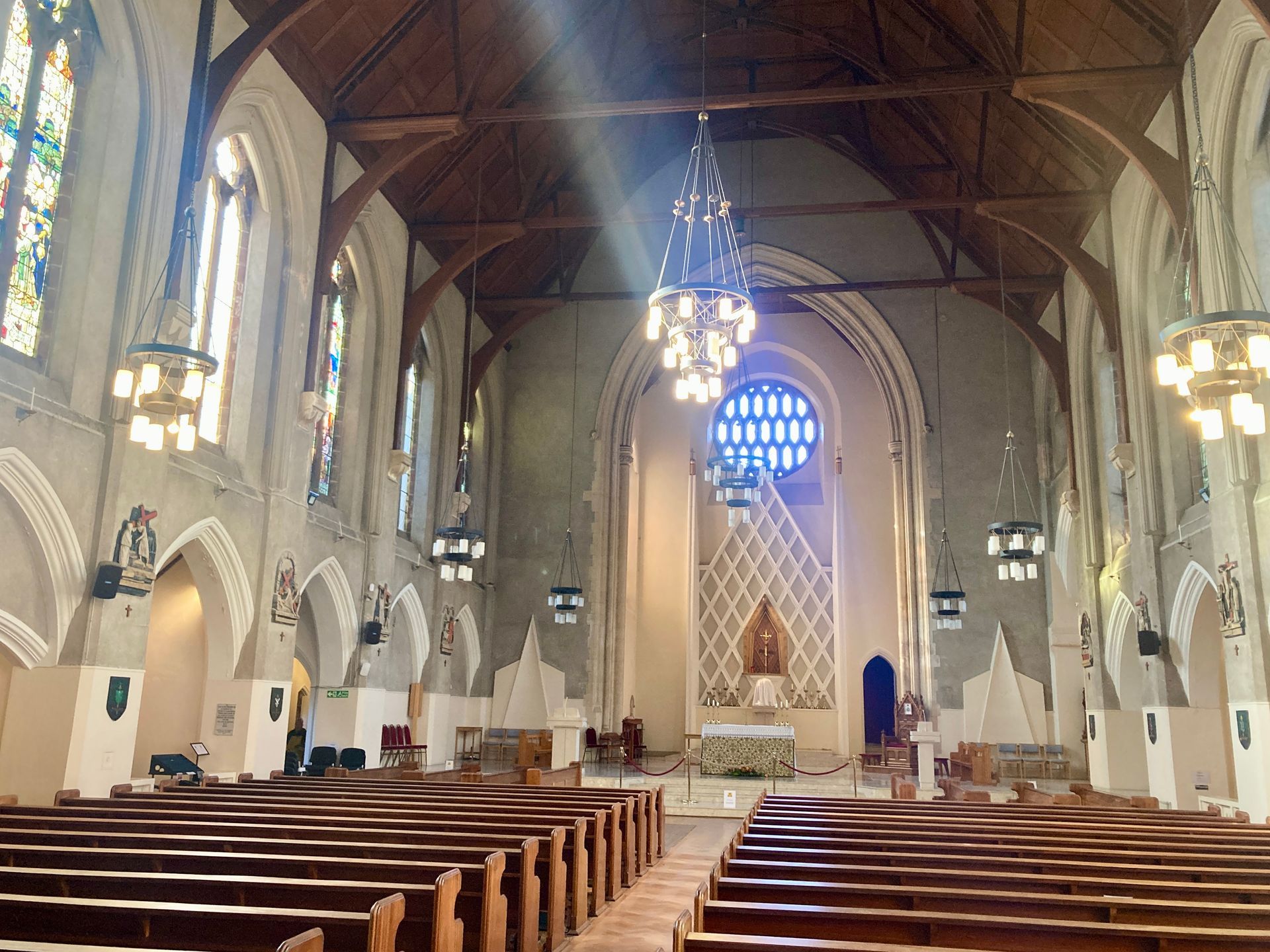 It is a low, brick building, constructed in 1987 and surrounded by out-of-town shops and busy roads. Inside the space is warm and welcoming and focussed on the high altar.