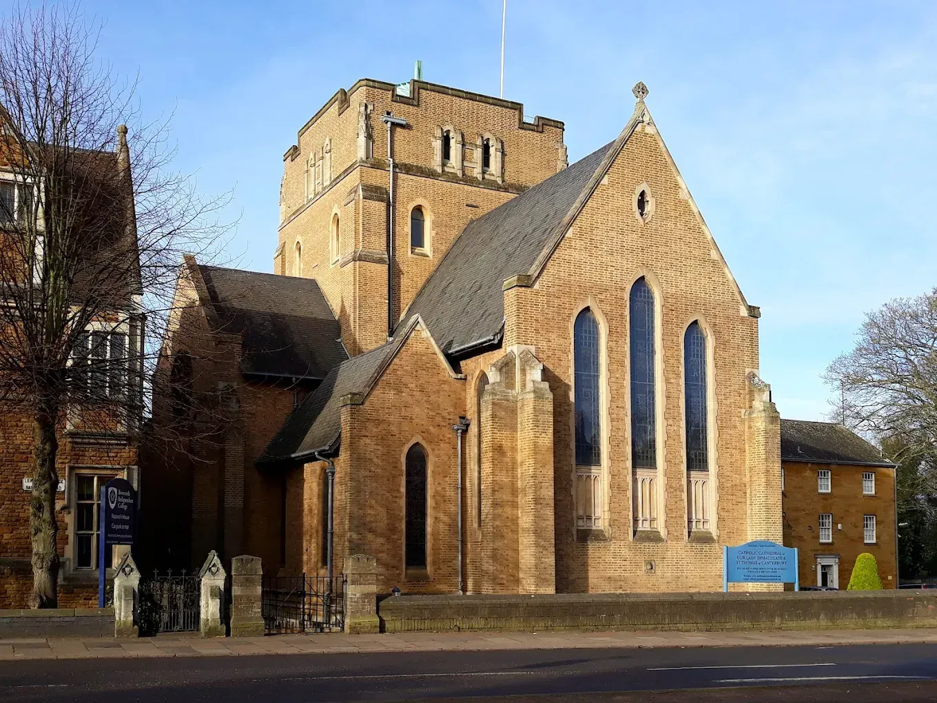 The Cathedral originated as a small chapel and residence in 1825, both of which survive. A further church was built in the 1840s to designs by A.W.N. Pugin. Following the restoration of the hierarchy and the creation of the Diocese of Northampton, E.W. Pugin prepared ambitious designs for a new cathedral in 1860, but these were only partly implemented. Much of the earlier church survived until the 1950s, when it was demolished to make way for a new tower, transepts and chancel, built to designs by A. Herbert. The interior has undergone several re-orderings.