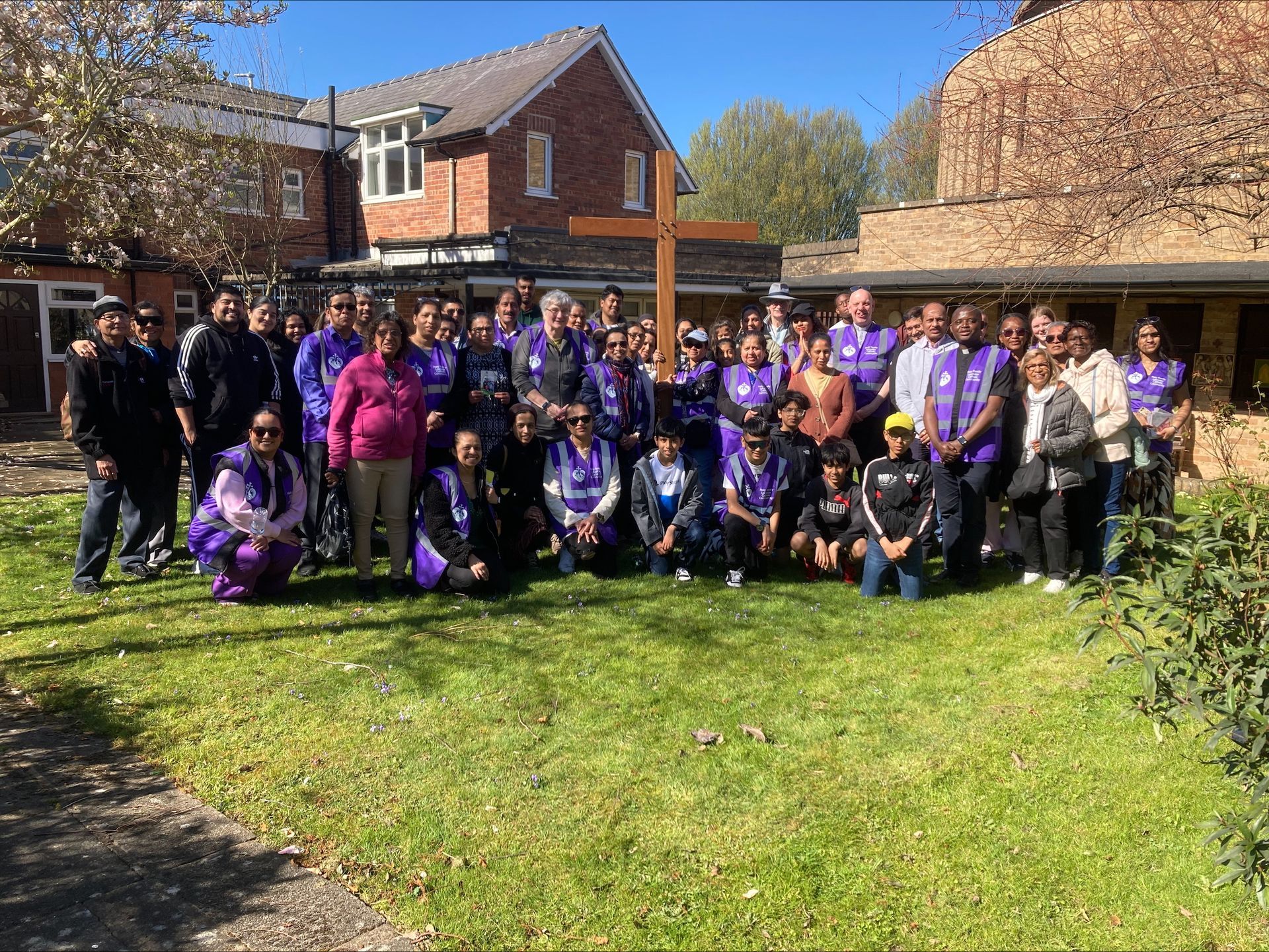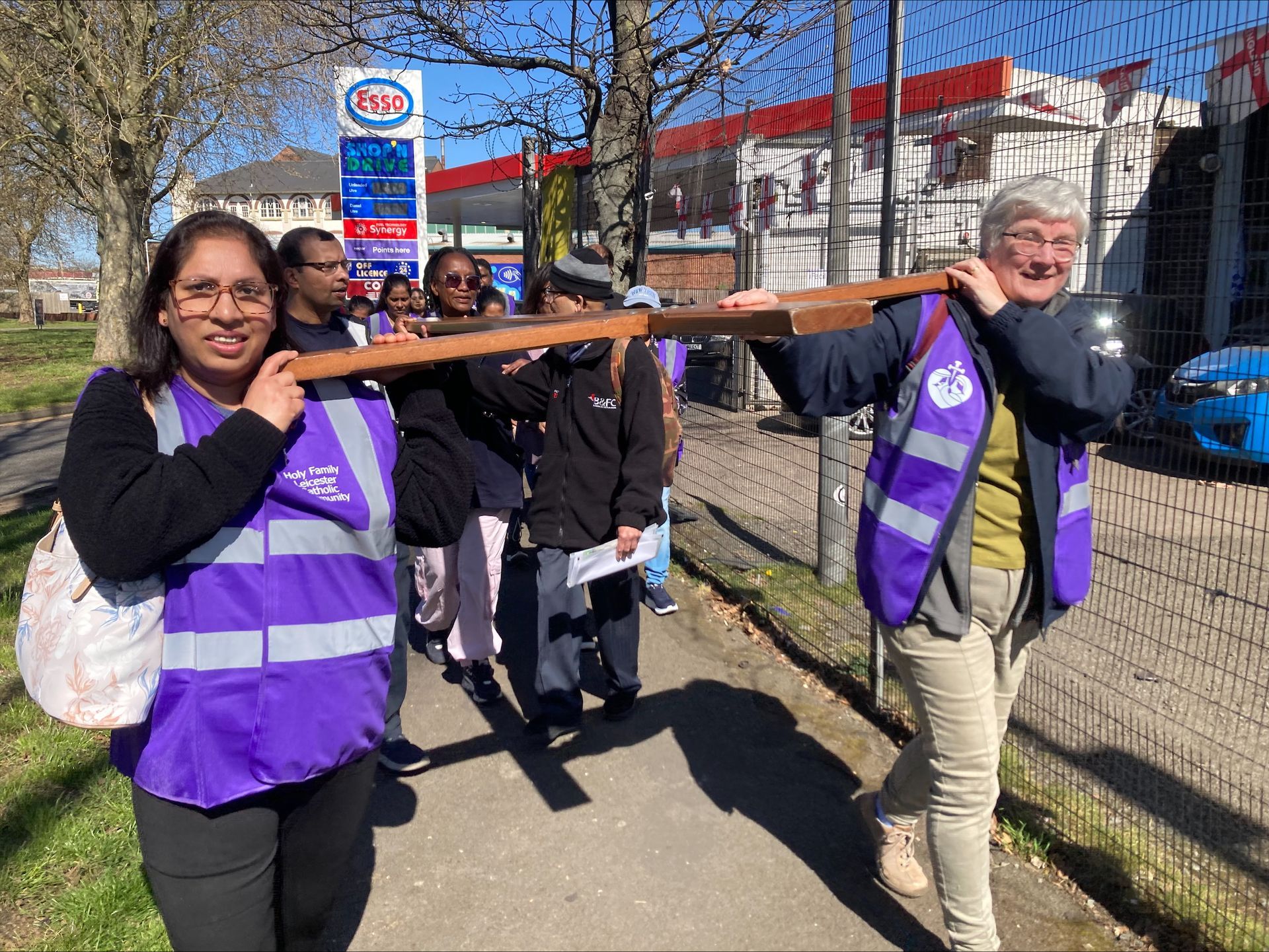 Holy Family Leicester consists of the churches of Sacred Heart with St Margaret Mary; Our Lady of Good Counsel; and St Josephs. A group of about 50 parishioners of all ages met after the regular 10.15am Mass at Our Lady’s. We put on our new purple parish high vis jackets, had a blessing from Fr Vitalis, then we took up the Pilgrim Cross, which had been borrowed from Midland Leg of Pilgrim Cross.
