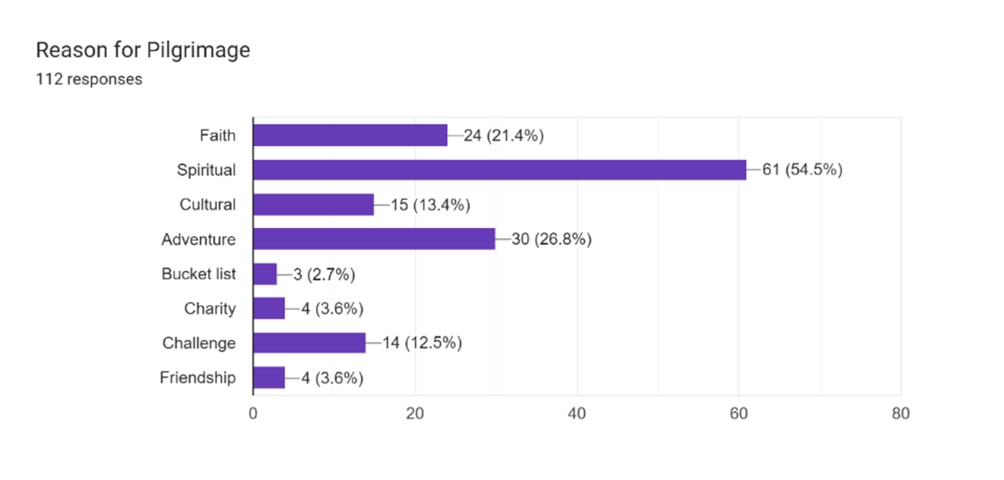 In an earlier survey conducted in 2022, the selection under ‘Reason for Pilgrimage’ proved interesting in that the choice of ‘Spiritual’ far outweighed ‘Faith’ and all other more secular reasons. Furthermore, in the previous year, the 2021 Office for National Statistics census saw not only a large decrease in people affiliating to Christianity, but an increase in those reporting ‘No Religion’. Out of those electing to express themselves as atheist, humanist or agnostic, the largest group aligning to “Any other religion” was agnostic. At a time when we appear to be bombarded with media and data evidence informing us that society is becoming ever more secular, it seemed startling to me that I would find the choice of ‘spiritual’ given as the main reason for embarking on a pilgrimage, so pronounced.