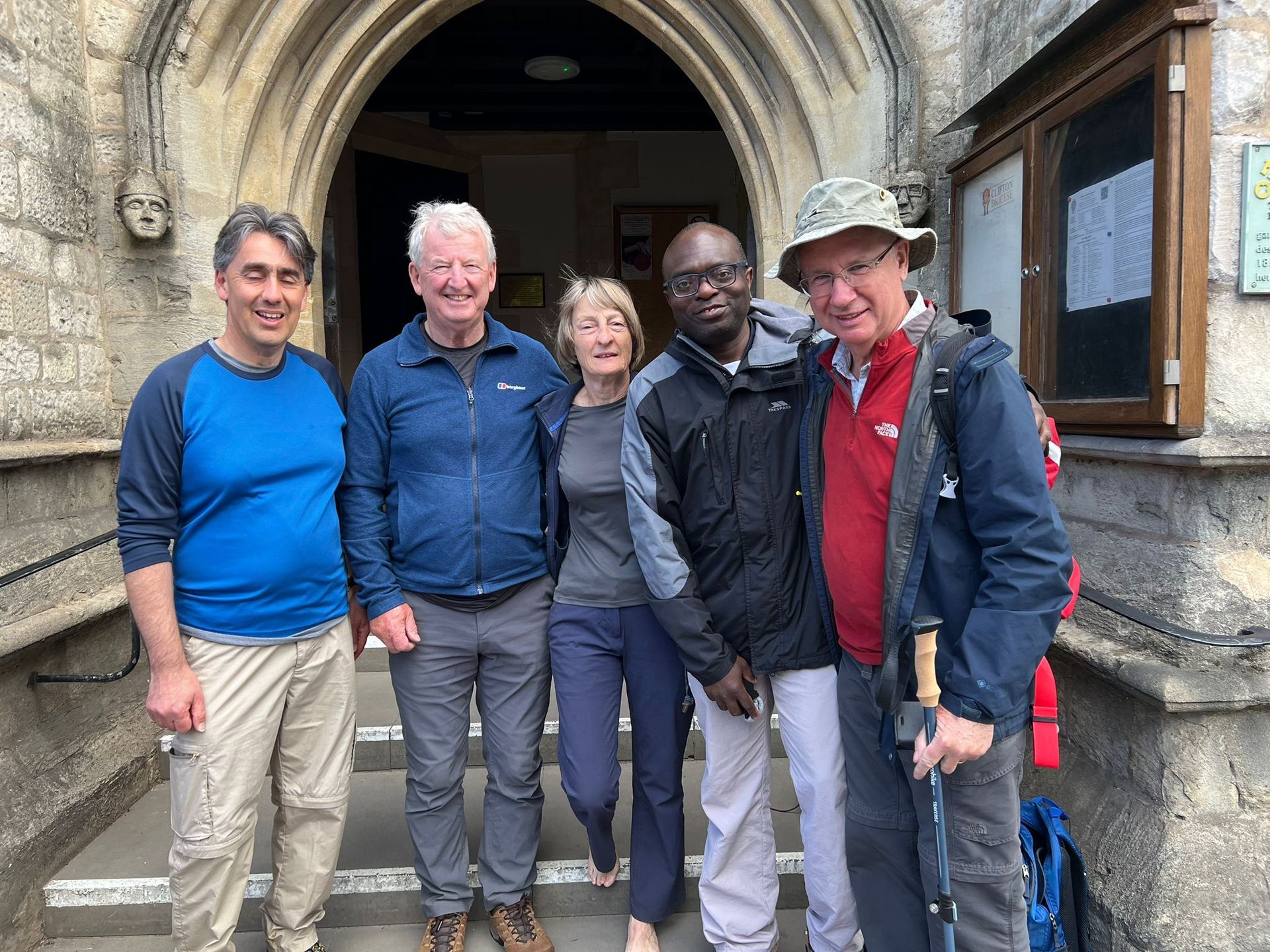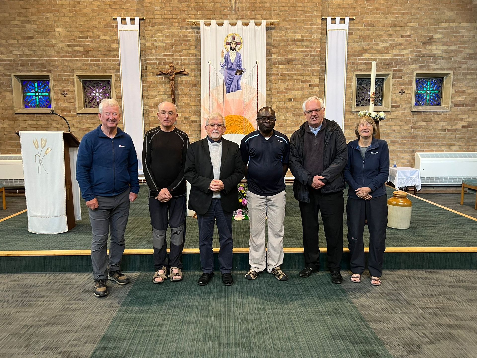 An early start today at 7.30am as it was to be a long walk to Clifton cathedral. Lauds outside St Paul’s, Yate and then off through Yate in the direction of Bristol. A mix of busy road and cross country paths got us past the M4 and M32 to the outskirts of Bristol. Then it was a case of weaving through out of town shopping and housing estates until we reached Westbury-on-Trym which is a beautiful town on the edge of Bristol. Phil being a resident was able to explain some of the history behind the houses and buildings. We visited Holy Trinity Parish Church (previously dedicated to SS Peter & Paul) and said a decade of the Rosary. A short lunch outside the church and then off up hill to the Downs before the long descent into Bristol. We passed by the Catholic Church of St Mary on the Quay before we arrived at Bristol cathedral. We were met by Rev’d Mel Takáč, Minor Canon for Worship and Liturgy, who explained some the interesting parts of the cathedral especially the anti-slavery exhibition currently on display. We just had enough time left to walk the last mile of our pilgrimage uphill to Clifton cathedral where the lovely ladies of the cathedral had made tea, coffee, cakes and biscuits for us and the visiting parishioners from around the St Wulstan’s Pastoral Area. 16.5 miles for our final day. A tour of eight stations for a Pilgrimage of Hope was available to all the visitors. Before Mass Fr Gerry gave a talk on St Wulstan. The conclusion to the Pastoral Area Pilgrimage was Mass to celebrate the Vigil of the Ascension of the Lord with Fr Gerry presiding and Fr Gary, Fr Stephen and Fr Benedict concelebrating assisted by Deacons Domenic and Bogden.