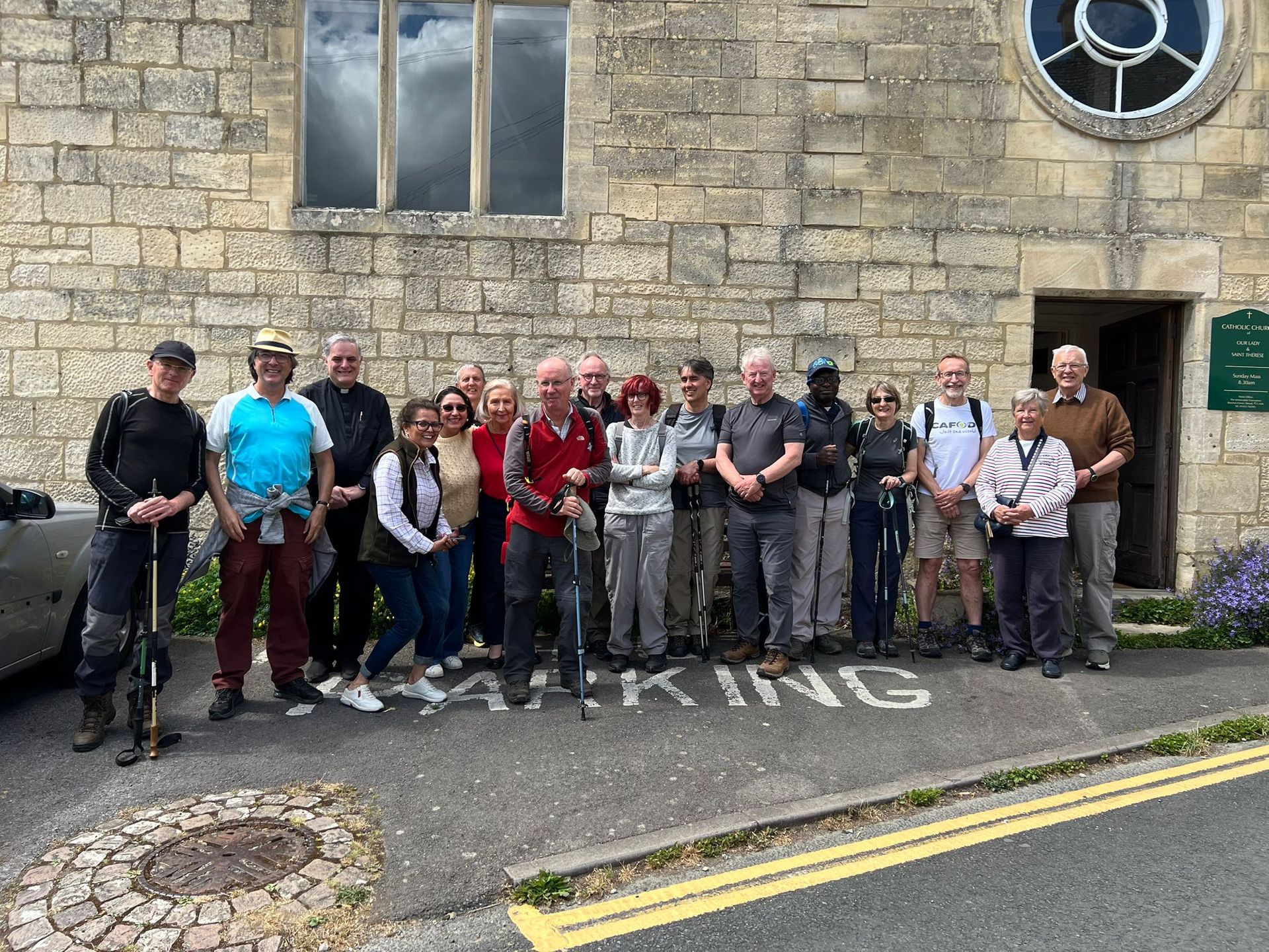 We started at St Peter’s 9am Mass. At the end of Mass, Mgr. Liam brought all the primary school children and the pilgrims to the front of the church. Mgr. Liam and the children held out their hands and gave the pilgrims a Blessing. Fr Gerry was on Mass duty so he joined us at Painswick after having done the first part of the walk earlier in the morning. We were joined by Tony again and another day pilgrim Daniel. Then we marched off to Painswick calling by St Augustine’s at Matson. A long and difficult climb to the Painswick Beacon across fields and woods. We finally reached the beacon and then descended to the RC church of Our Lady and St Thérèse in Painswick. We were greeted by Fr Gary and the parishioners and treated to a wonderful lunch! A short prayer and blessing by Fr Gary and then we were joined by more pilgrims: Martin, Savannah, Matthew, Mike, Phil and Caroline on the way to Stonehouse. We exited Painswick via St Mary’s church and climbed up into the Cotswold hills before descending to Stonehouse. At arrival at St Joseph’s we are ‘clapped in’ by Fr Gary and the parishioners, then we are treated to a delicious meal prepared by them. Holy Hour and Benediction before departing with our host parishioners. A 14 mile day.