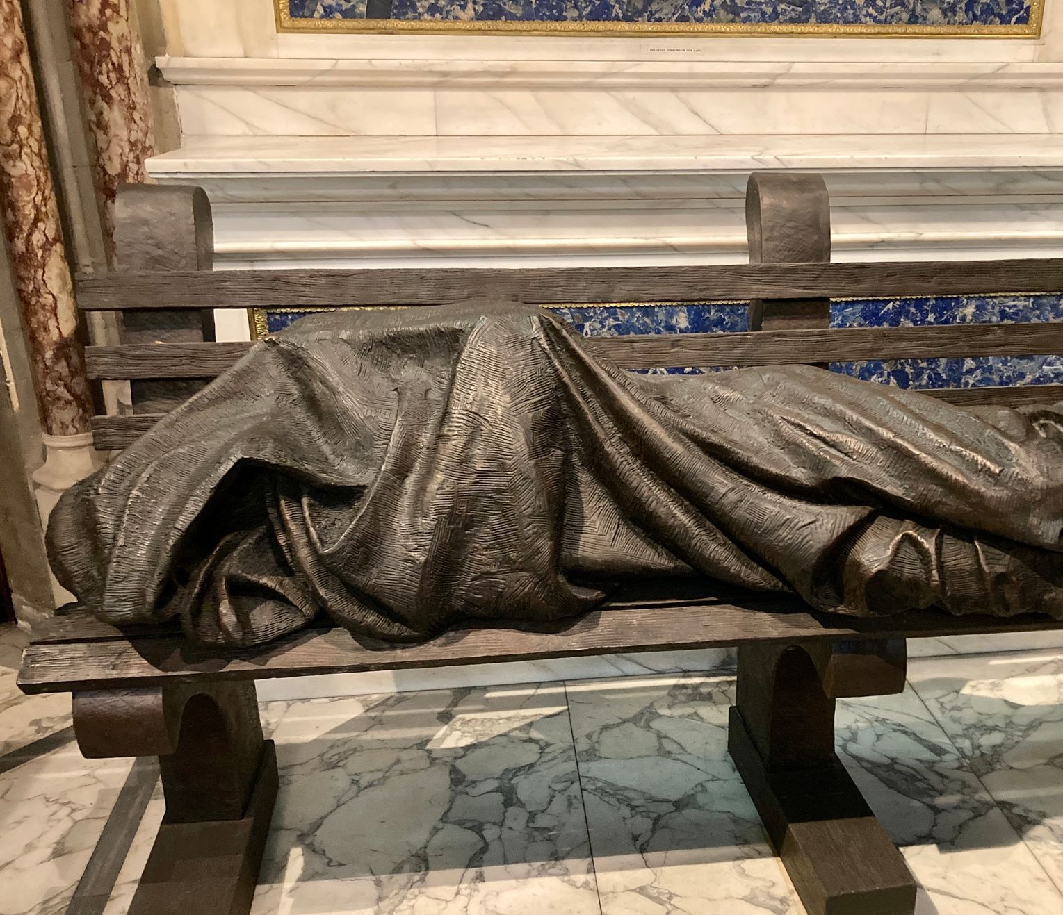 In 1966 Farm St became a parish and today it is also the parish base for the Westminster Diocesan LGBT Catholic community. The parish has a focus on service to the homeless, refugees, trafficked people and those who suffer on account of faith. There is a moving statue by Timothy Schmalz depicting Jesus as a homeless person, sleeping on a park bench. His face and hands are obscured by a blanket, but crucifixion wounds on his feet reveal his identity. The statue can be found in the side chapel of Our Lady of the Seven Dolours.